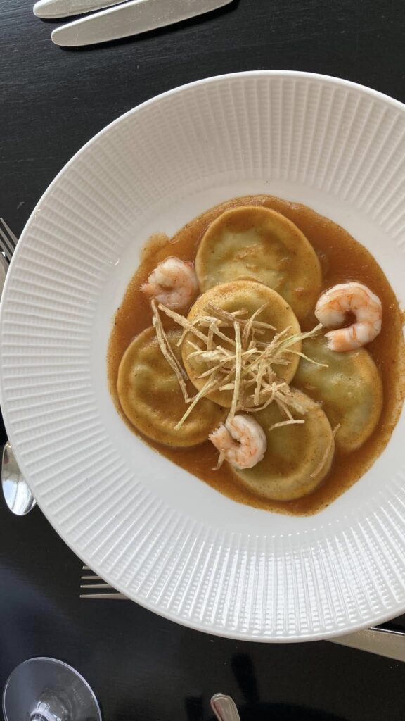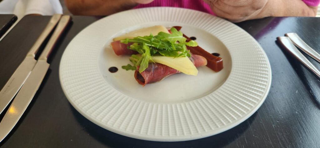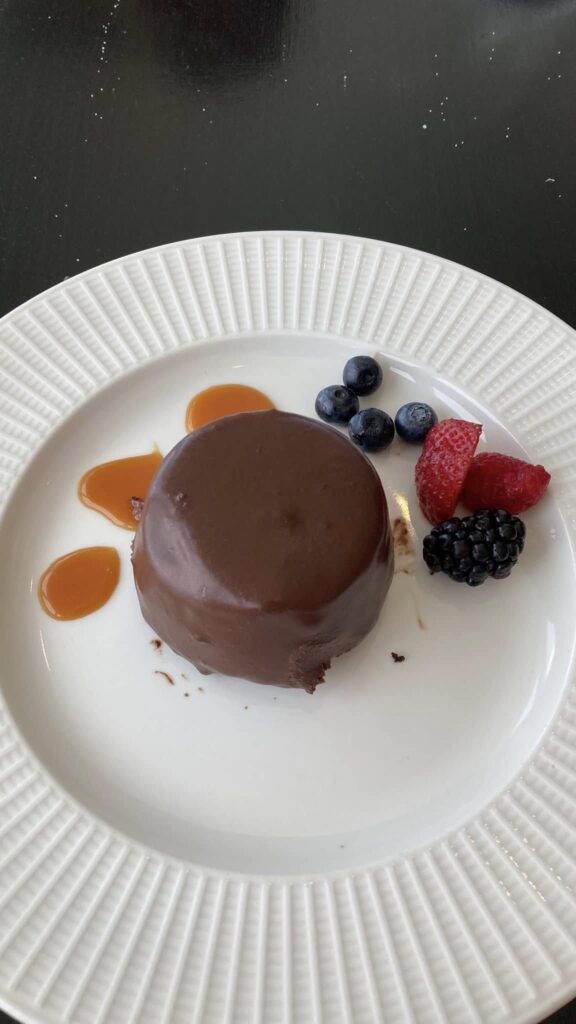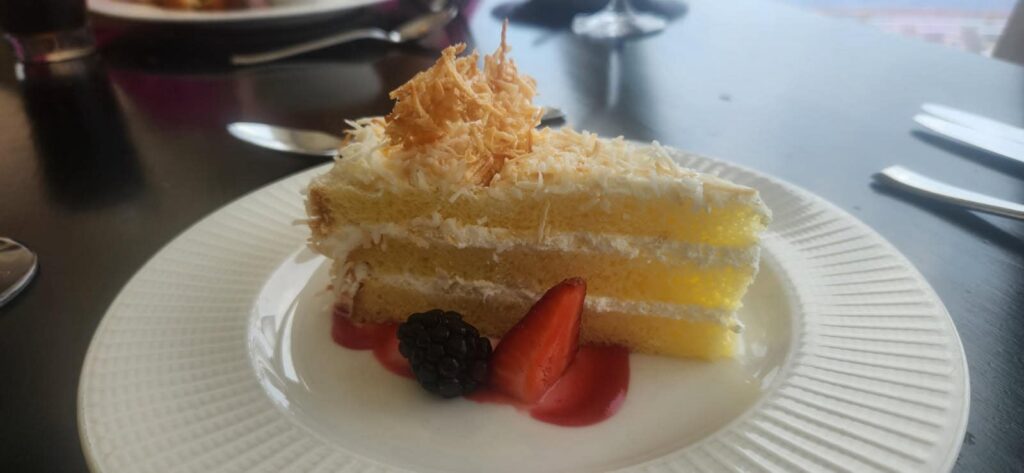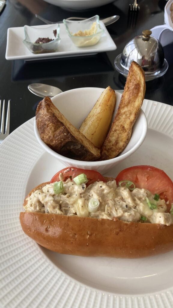 We finally decided to try coastal lichen. Margarita flatbread, ham wrapped dates, lobster and shrimp ravioli, chicken salad sandwich, chocolate cake and coconut cake. View was great.