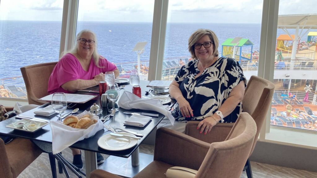 Cruise update. Rachel and I are doing pretty good for our first cruise together. She drove in from Oklahoma starting out a day before me and as I was about to walk into the terminal my phone rang and it was Rachel saying Jeff had just dropped her off, she had checked her suitcase and asked where I was. I told her I was about to walk in terminal and a 4 was on the post. She said she was by a 3 post. We each walked in and there we were—together. Perfect timing even if we were not trying to arrive same time.