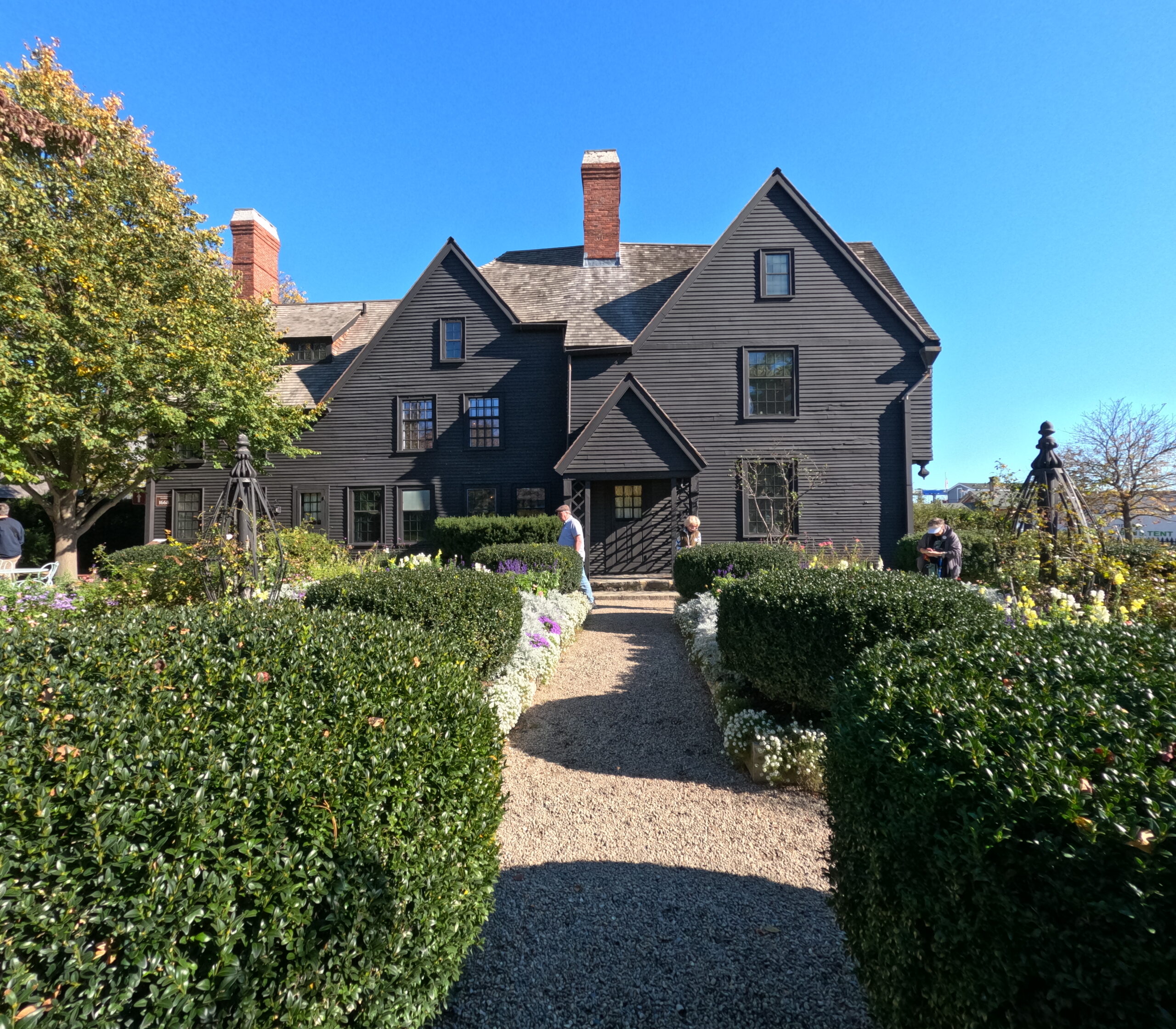 After that we just wandered around and saw the witch memorial, which is just benches with their names on it. Walked down the very packed Essex street which was smartly closed to traffic. Tons of people, lots in costume as visitor, tip taking entertainer, and actual bums. We didn’t go in any of the shops since we don’t need any more cheap crap, but there were long lines waiting to get into some. By the time we got down to the Elizabeth Montgomery statue, we were pretty pooped. We wandered away from the crowd to just see the exterior of the witch house and then a bit further to see the very nice houses around Hamilton Hall. We got a Lyft back from there. Lots of construction and traffic coming back.